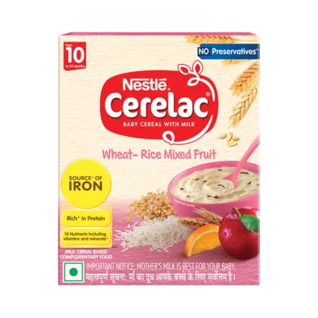 Nestle CERELAC Wheat Rice Mixed Fruit is a complementary baby food for infants from 10 to 24 months. 2 serves of CERELAC Wheat Rice Mixed Fruit Cereal provide 37% of a baby’s daily need of iron. It is also a source of 14 important nutrients including vitamins and minerals. This baby food cereal is rich in protein and packed with the goodness of cereal, milk, and fruits. With 155 years of scientific expertise in infant nutrition, Nestle develops infant nutrition products backed by evolving science and research. Innovation has been at the heart of Nestle since its beginning.